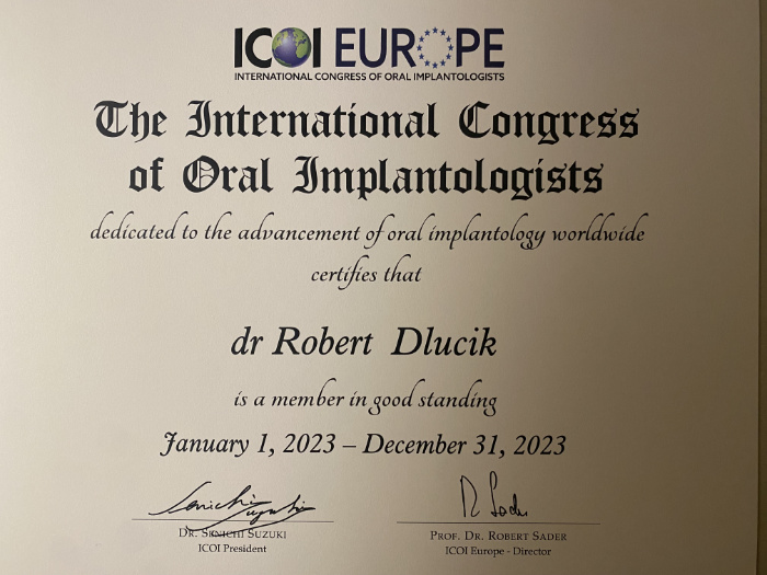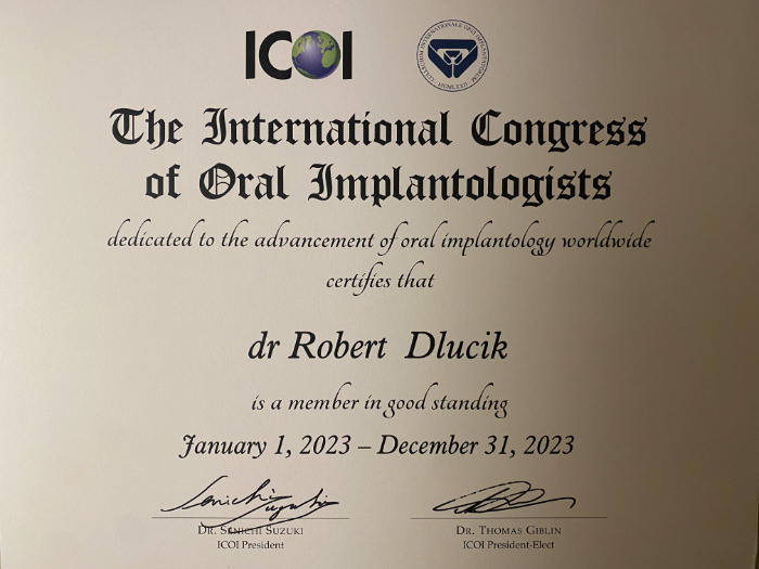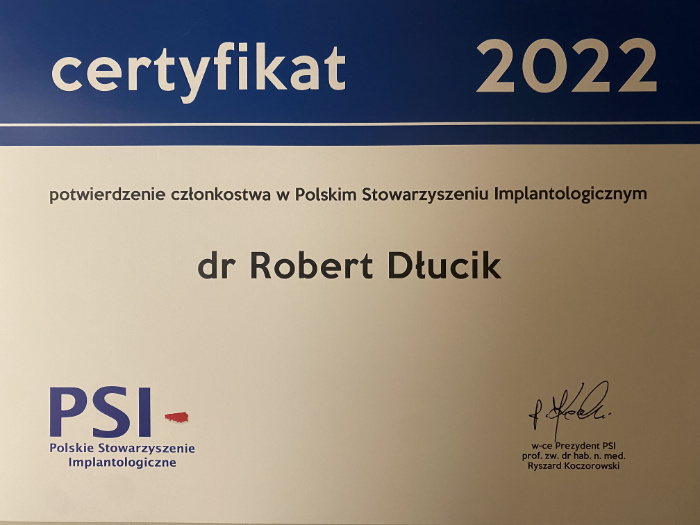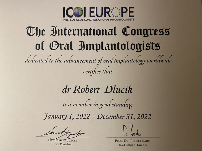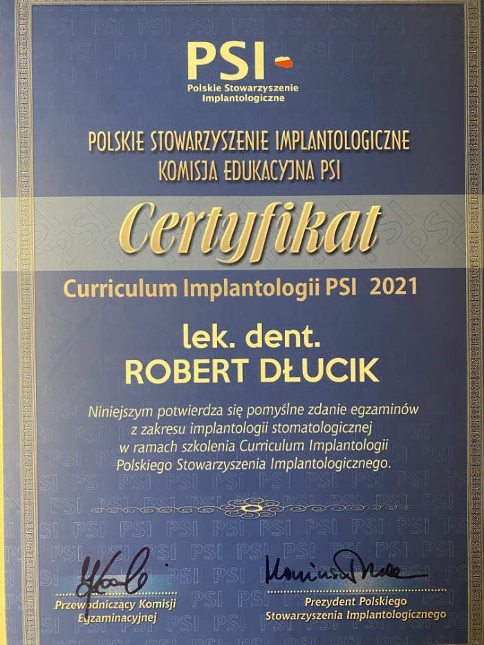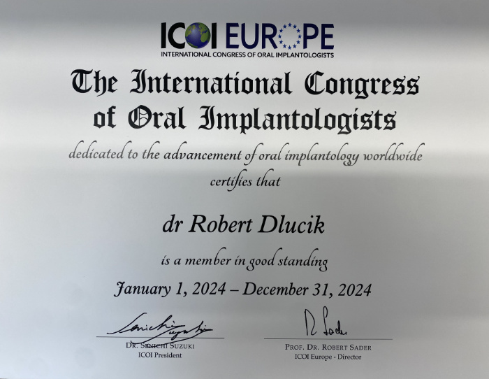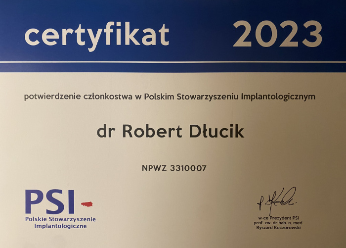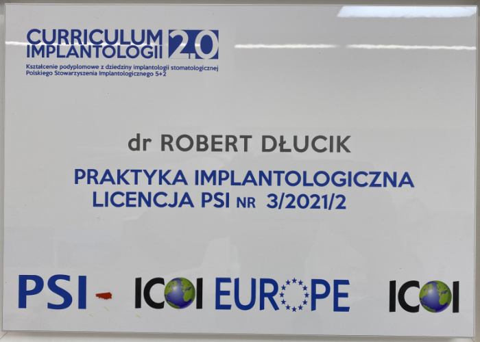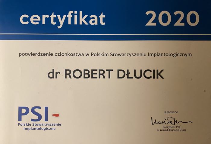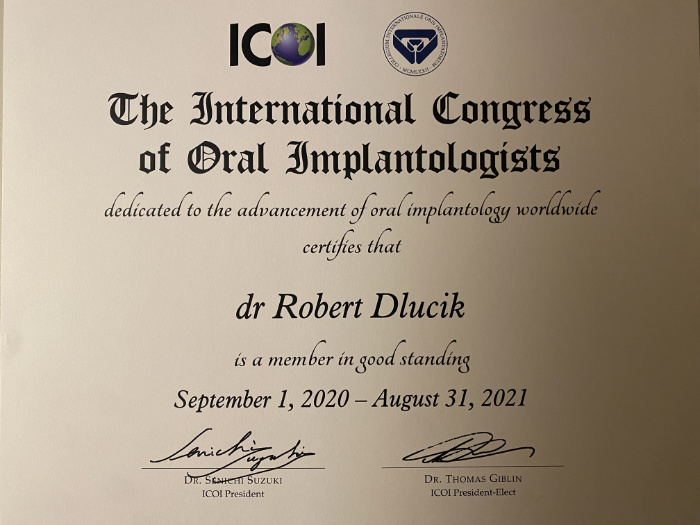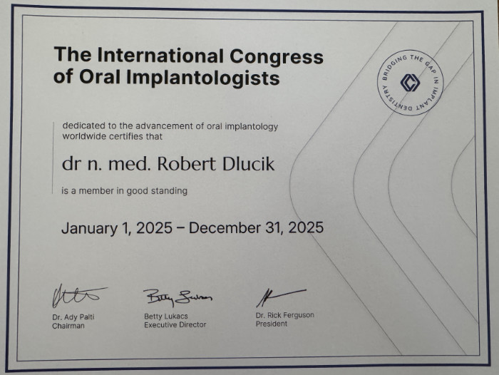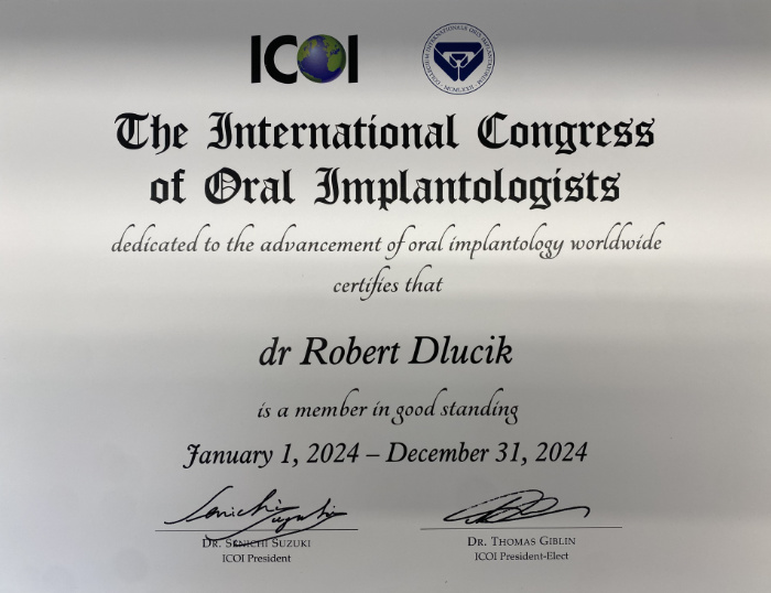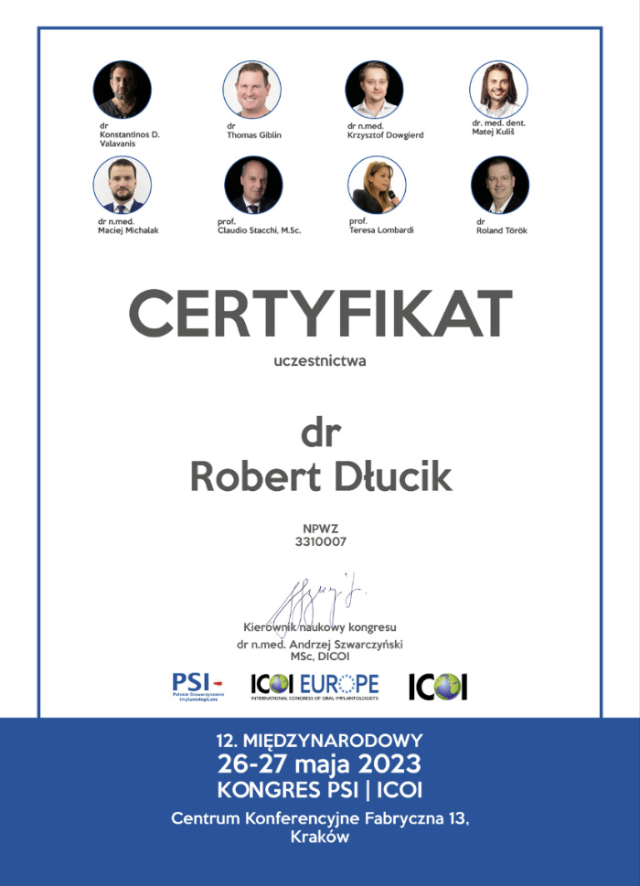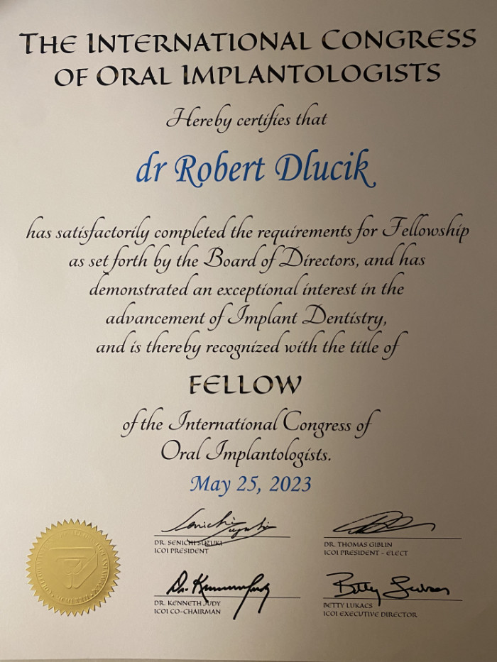 Dr n. med. Robert Dłucik lekarz implantolog jest absolwentem Wydziału Lekarsko – Dentystycznego na Uniwersytecie Pavla Jozefa Safarika w Koszycach. Ukończył z wyróżnieniem Curriculum Implantologii i posiada Licencję Praktyki Implantologicznej Polskiego Stowarzyszenia Implantologicznego z afiliacją International Congress of Oral Implantologists – ICOI i New York University College of Dentistry. Od wielu lat jest aktywnym członkiem PSI i ICOI. Za pomyślne zdanie egzaminu fellowship PSI/ICOI otrzymał tytuł „lekarz implantolog”. W 2019 roku dr Robert Dłucik ukończył maraton implantologiczny Trinon Collegium Practicum na Dominikanie.