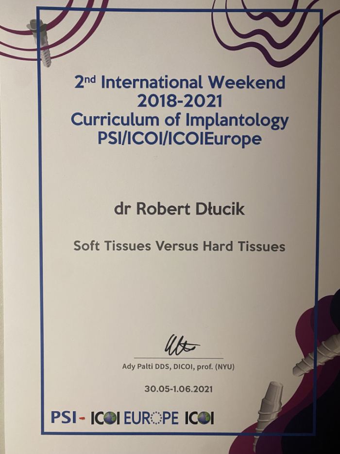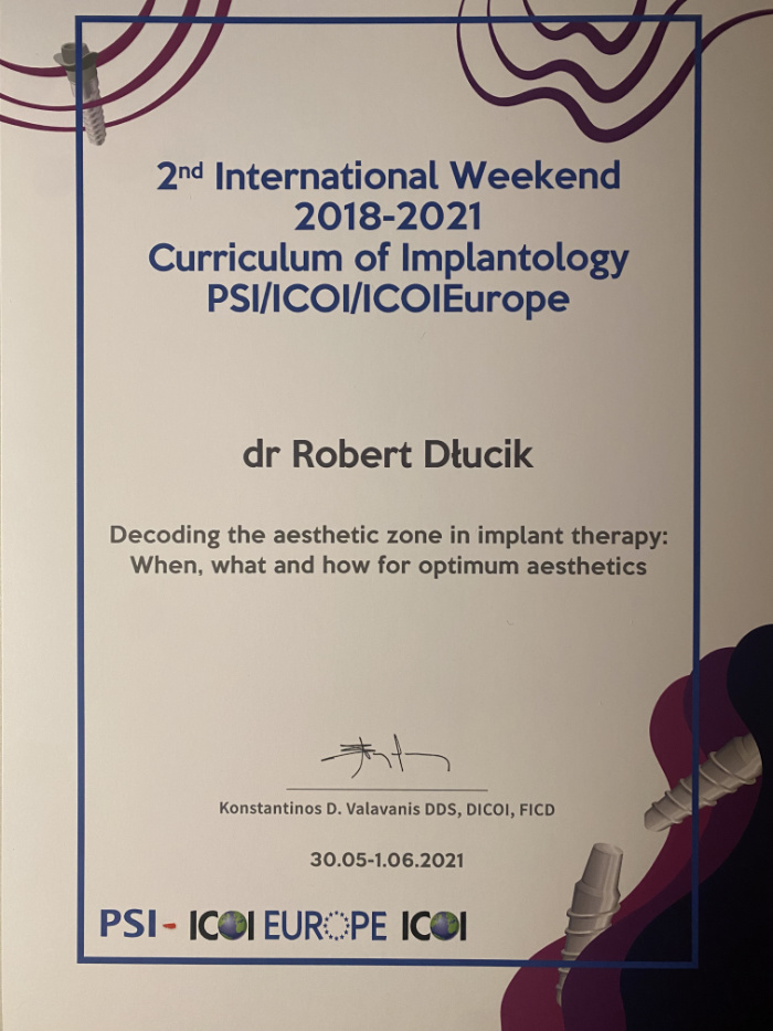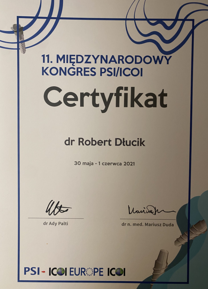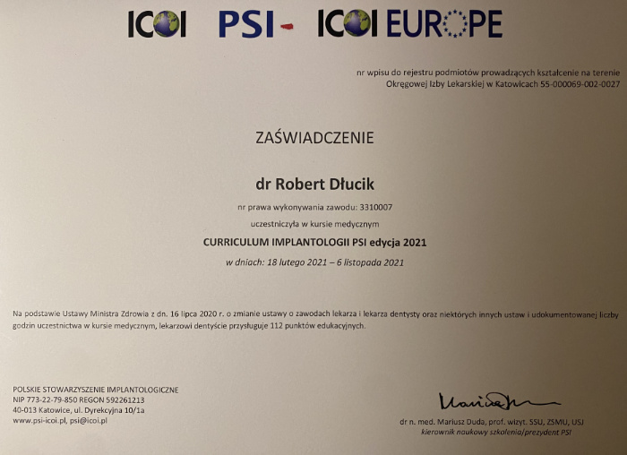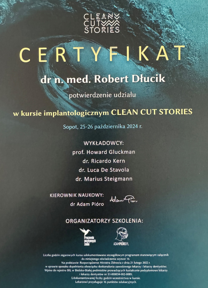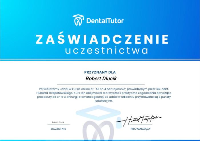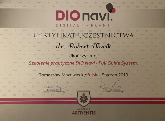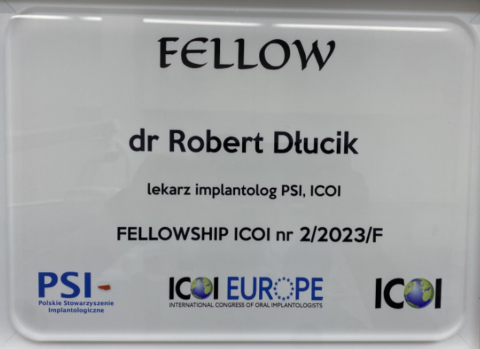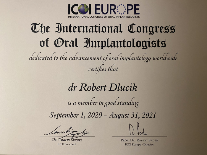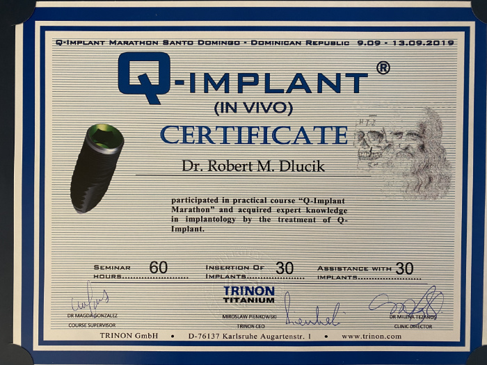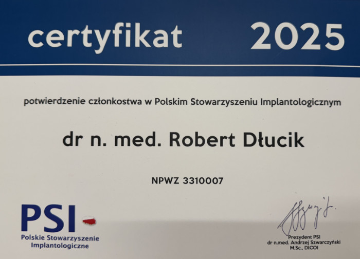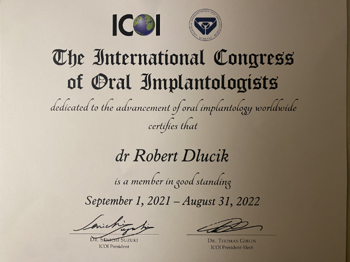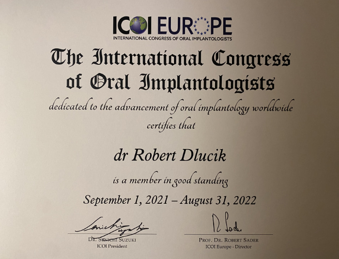 Dr n. med. Robert Dłucik lekarz implantolog jest absolwentem Wydziału Lekarsko – Dentystycznego na Uniwersytecie Pavla Jozefa Safarika w Koszycach. Ukończył z wyróżnieniem Curriculum Implantologii i posiada Licencję Praktyki Implantologicznej Polskiego Stowarzyszenia Implantologicznego z afiliacją International Congress of Oral Implantologists – ICOI i New York University College of Dentistry. Od wielu lat jest aktywnym członkiem PSI i ICOI. Za pomyślne zdanie egzaminu fellowship PSI/ICOI otrzymał tytuł „lekarz implantolog”. W 2019 roku dr Robert Dłucik ukończył maraton implantologiczny Trinon Collegium Practicum na Dominikanie.
