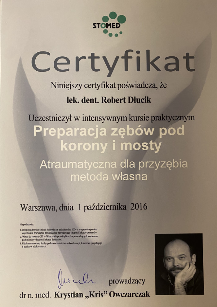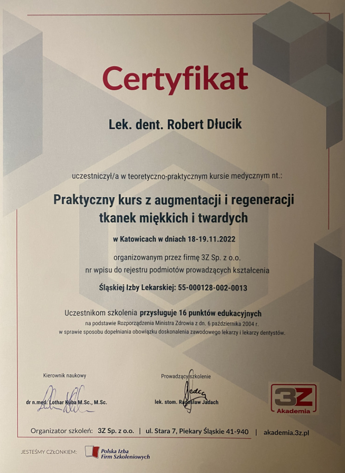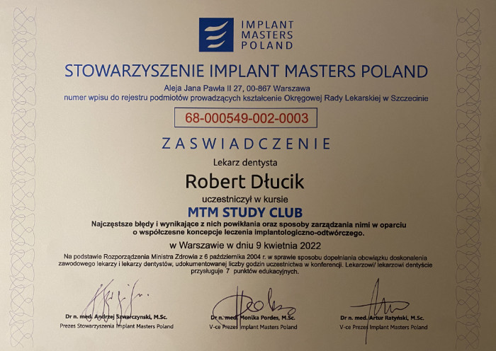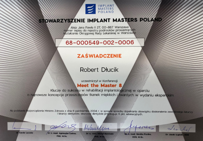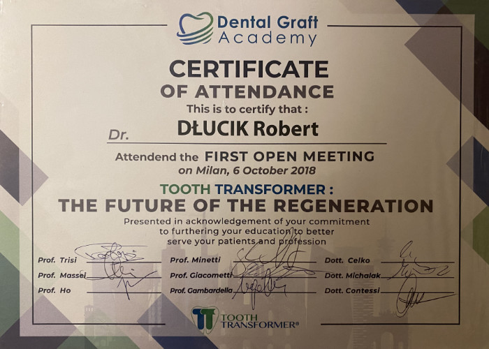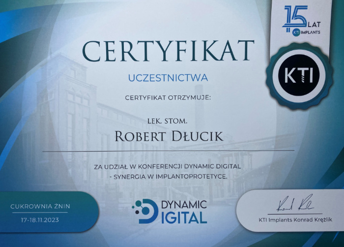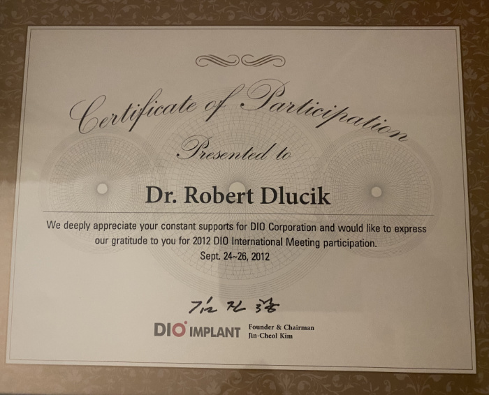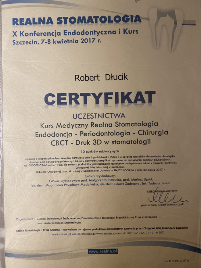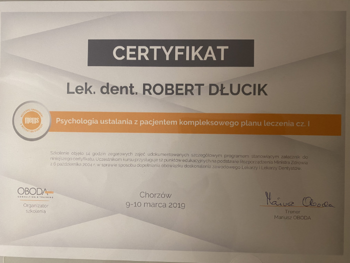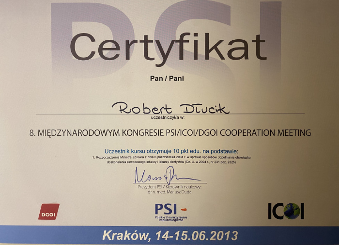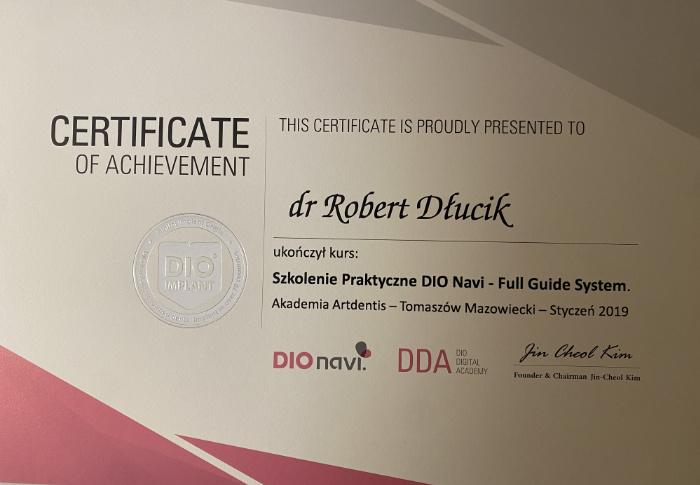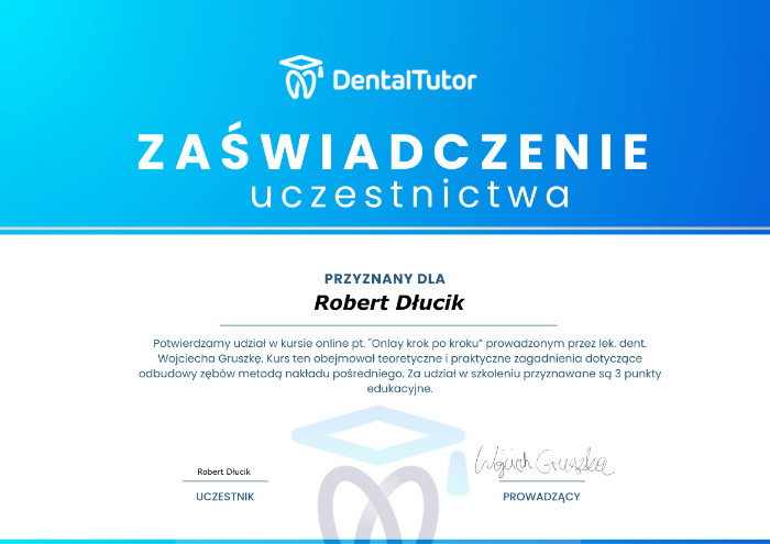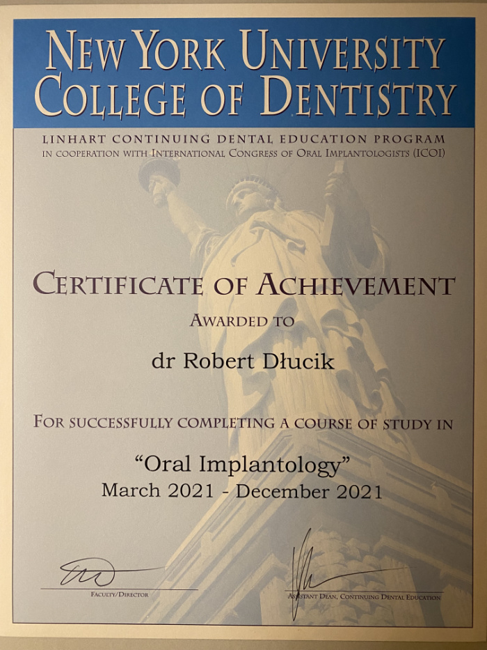 Dr n. med. Robert Dłucik lekarz implantolog jest absolwentem Wydziału Lekarsko – Dentystycznego na Uniwersytecie Pavla Jozefa Safarika w Koszycach. Ukończył z wyróżnieniem Curriculum Implantologii i posiada Licencję Praktyki Implantologicznej Polskiego Stowarzyszenia Implantologicznego z afiliacją International Congress of Oral Implantologists – ICOI i New York University College of Dentistry. Od wielu lat jest aktywnym członkiem PSI i ICOI. Za pomyślne zdanie egzaminu fellowship PSI/ICOI otrzymał tytuł „lekarz implantolog”. W 2019 roku dr Robert Dłucik ukończył maraton implantologiczny Trinon Collegium Practicum na Dominikanie.