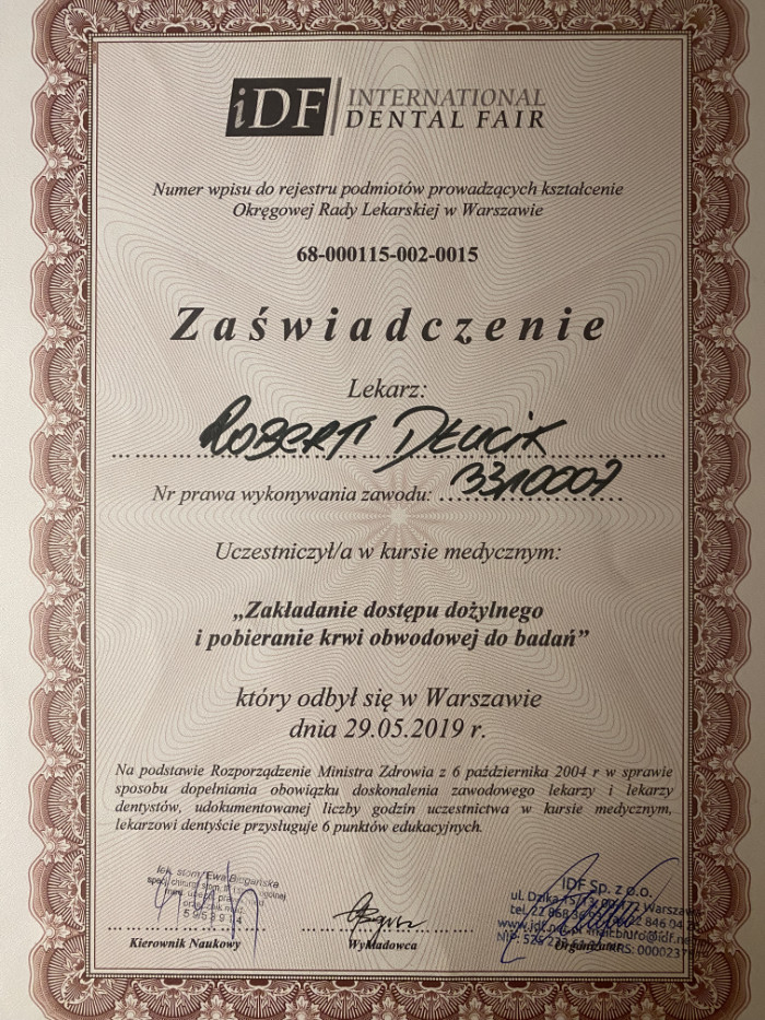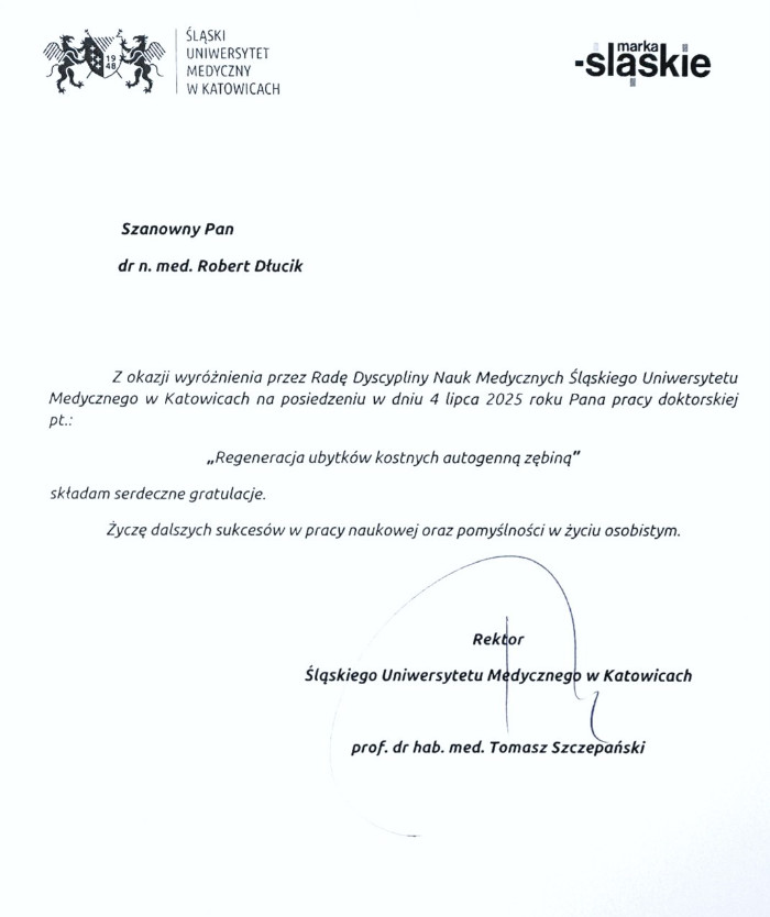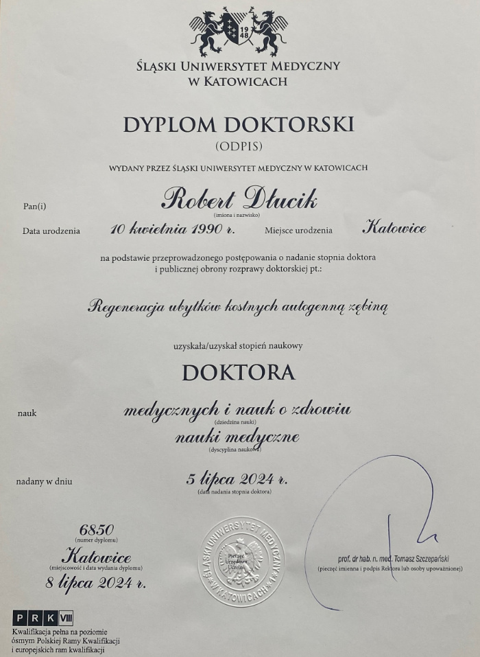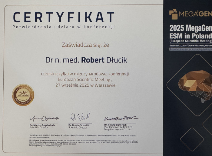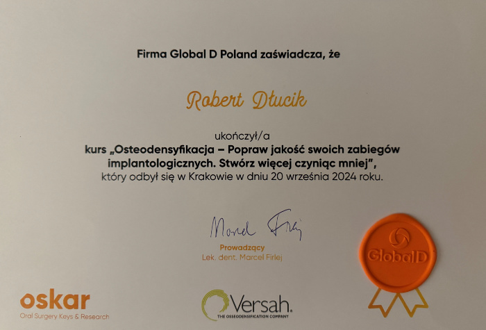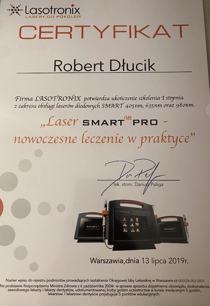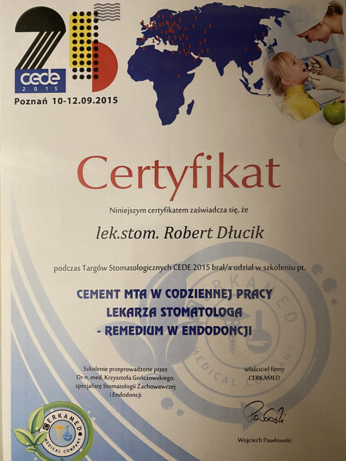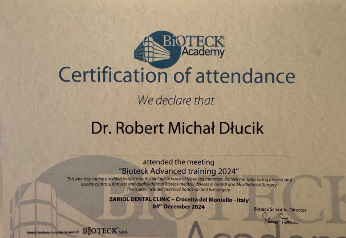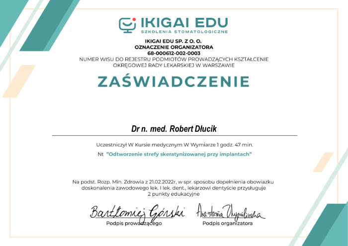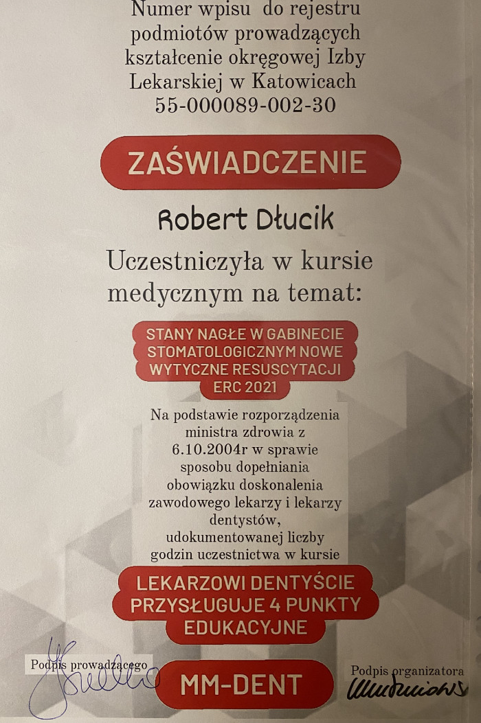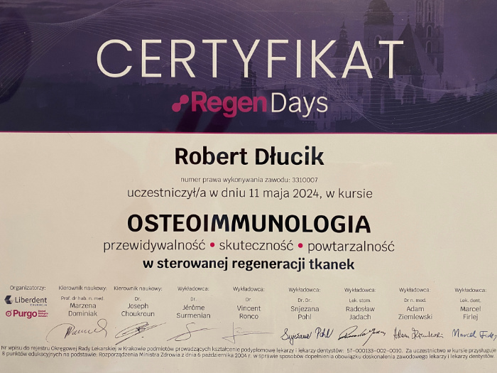 Dr n. med. Robert Dłucik lekarz implantolog jest absolwentem Wydziału Lekarsko – Dentystycznego na Uniwersytecie Pavla Jozefa Safarika w Koszycach. Ukończył z wyróżnieniem Curriculum Implantologii i posiada Licencję Praktyki Implantologicznej Polskiego Stowarzyszenia Implantologicznego z afiliacją International Congress of Oral Implantologists – ICOI i New York University College of Dentistry. Od wielu lat jest aktywnym członkiem PSI i ICOI. Za pomyślne zdanie egzaminu fellowship PSI/ICOI otrzymał tytuł „lekarz implantolog”. W 2019 roku dr Robert Dłucik ukończył maraton implantologiczny Trinon Collegium Practicum na Dominikanie.